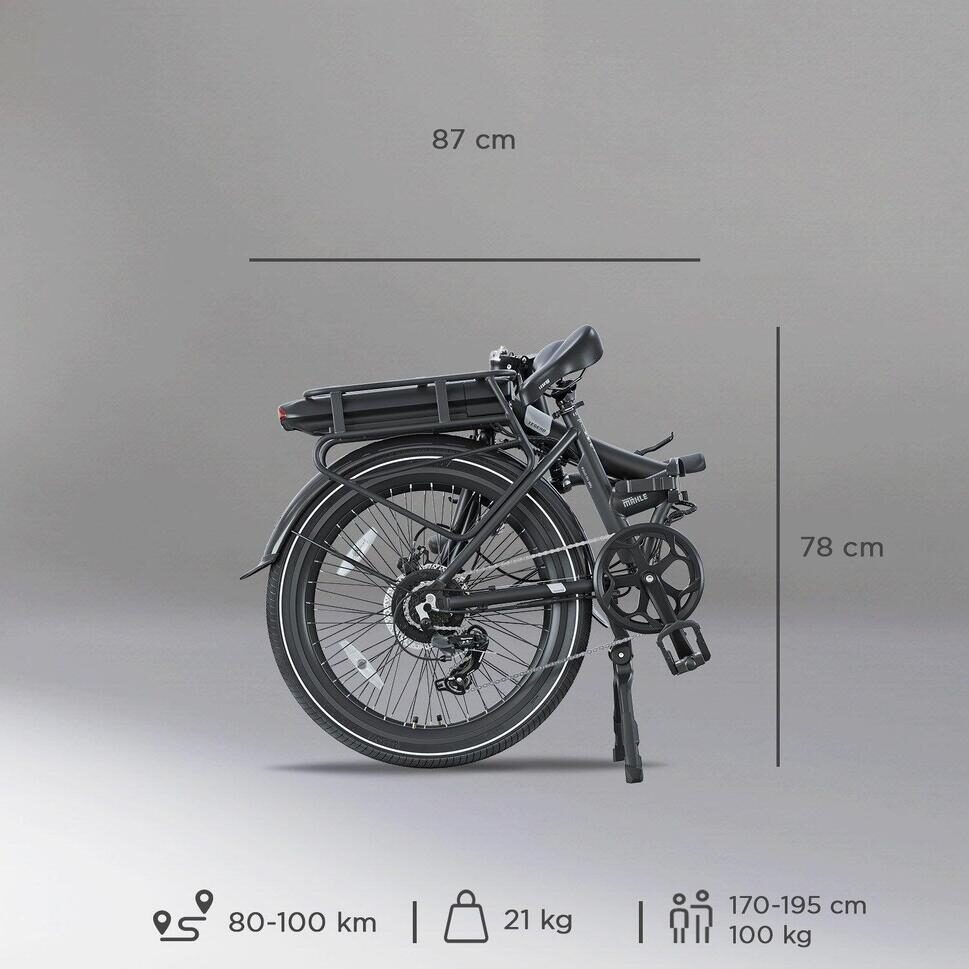 Rama roweru wykonana z lekkiego aluminium i 24-calowe koła zapewniają wygodną jazdę, a możliwość szybkiego złożenia w mniej niż 5 sekund sprawia, że rower jest łatwy w transporcie. Po złożeniu ma wymiary 87 x 80 x 46 cm i waży tylko 21 kg, co czyni go idealnym do przechowywania w mieszkaniach i małych przestrzeniach.