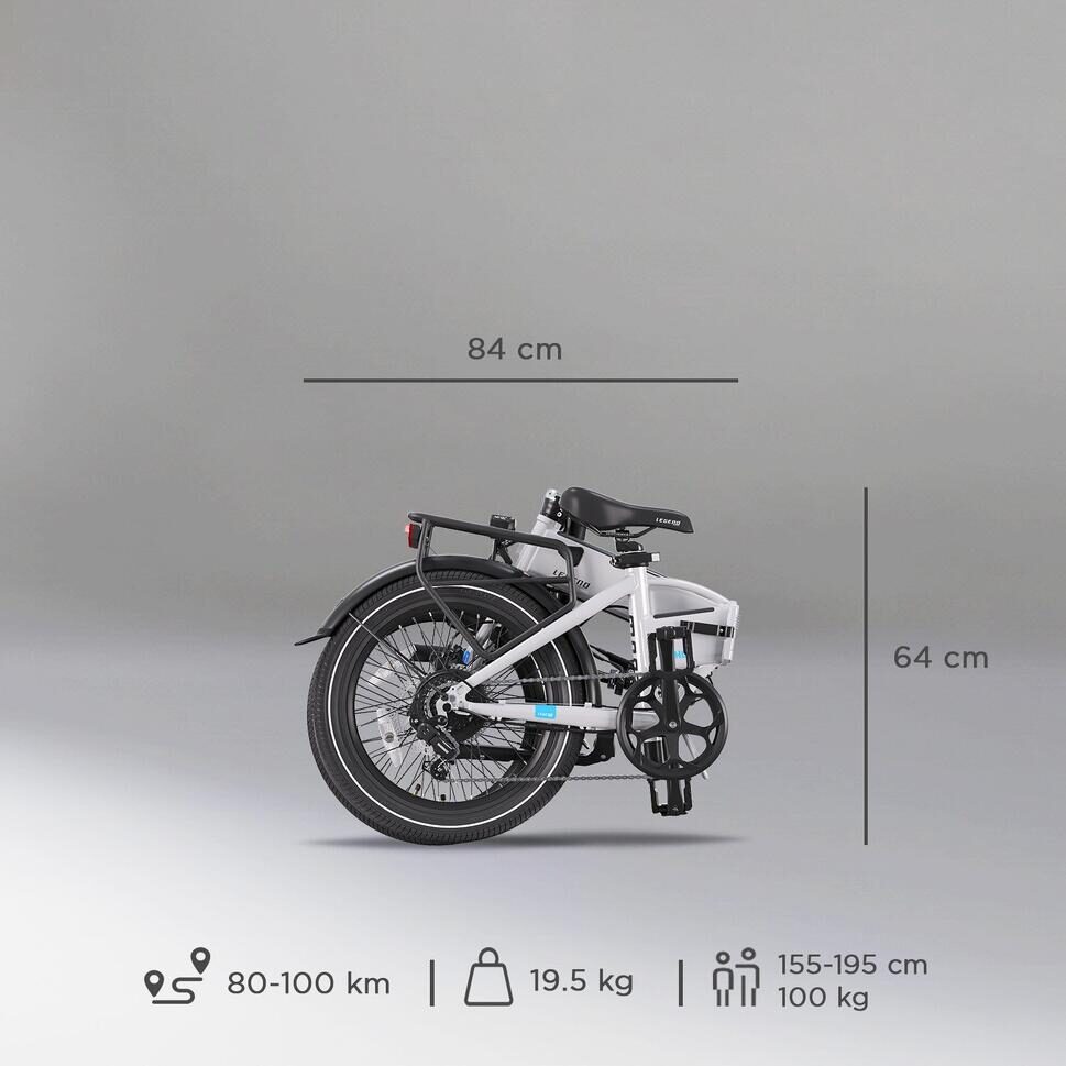 Rama aluminiowa o starannie zaprojektowanej geometrii składa się w mniej niż 5 sekund. Po złożeniu rower ma wymiary 69 × 84,5 × 45 cm, dzięki czemu łatwo zmieścisz go w bagażniku, windzie czy mieszkaniu.